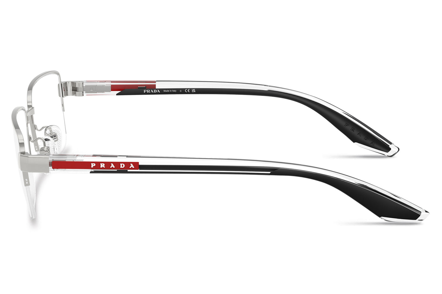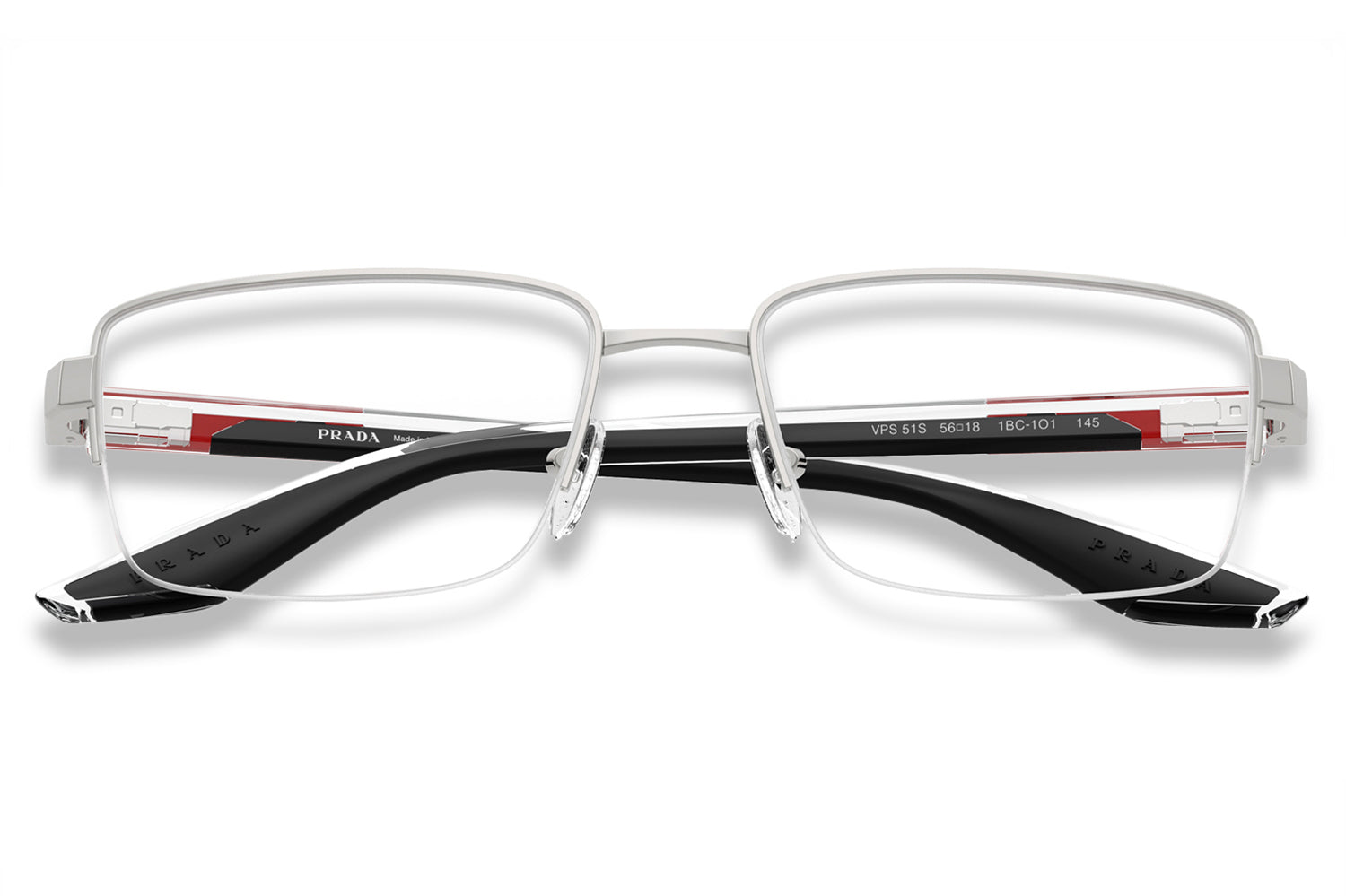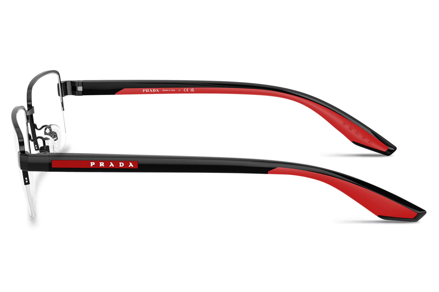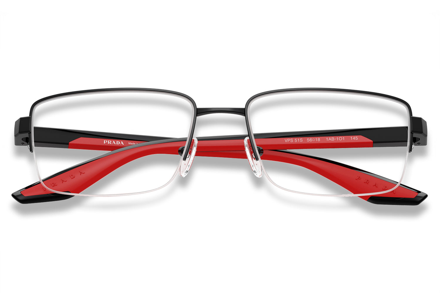 The Prada Linea Rossa - PS 51SV optical frame showcases clean lines in a refined semi-rimless rectangular design built for everyday versatility. Born from Prada Linea Rossa’s performance-driven heritage, this style pairs a lightweight metal front with injected temples for lasting comfort and durability. Rubber-injected temple tips enhance grip and wearability, while the iconic red stripe logo adds signature appeal. Available in coordinated metal colorways, including a standout shiny black option with red tips, these designer optical frames blend precision, comfort, and modern Italian style. Comes complete with a Prada Linea Rossa box, protective case, cleaning cloth, and a 1-year manufacturer’s warranty.