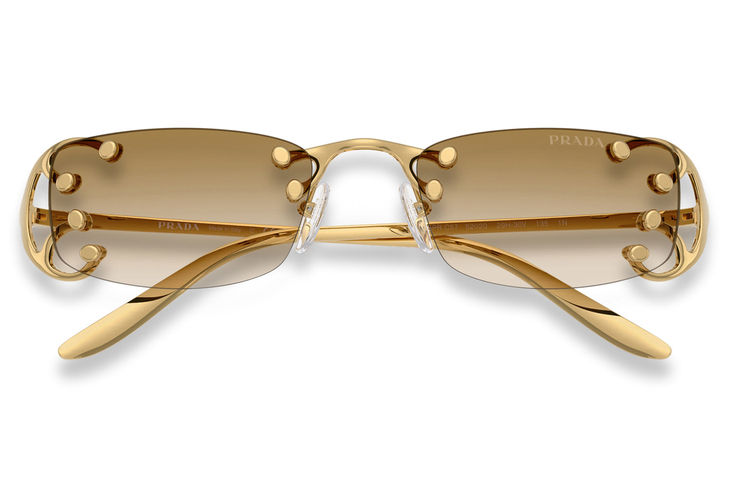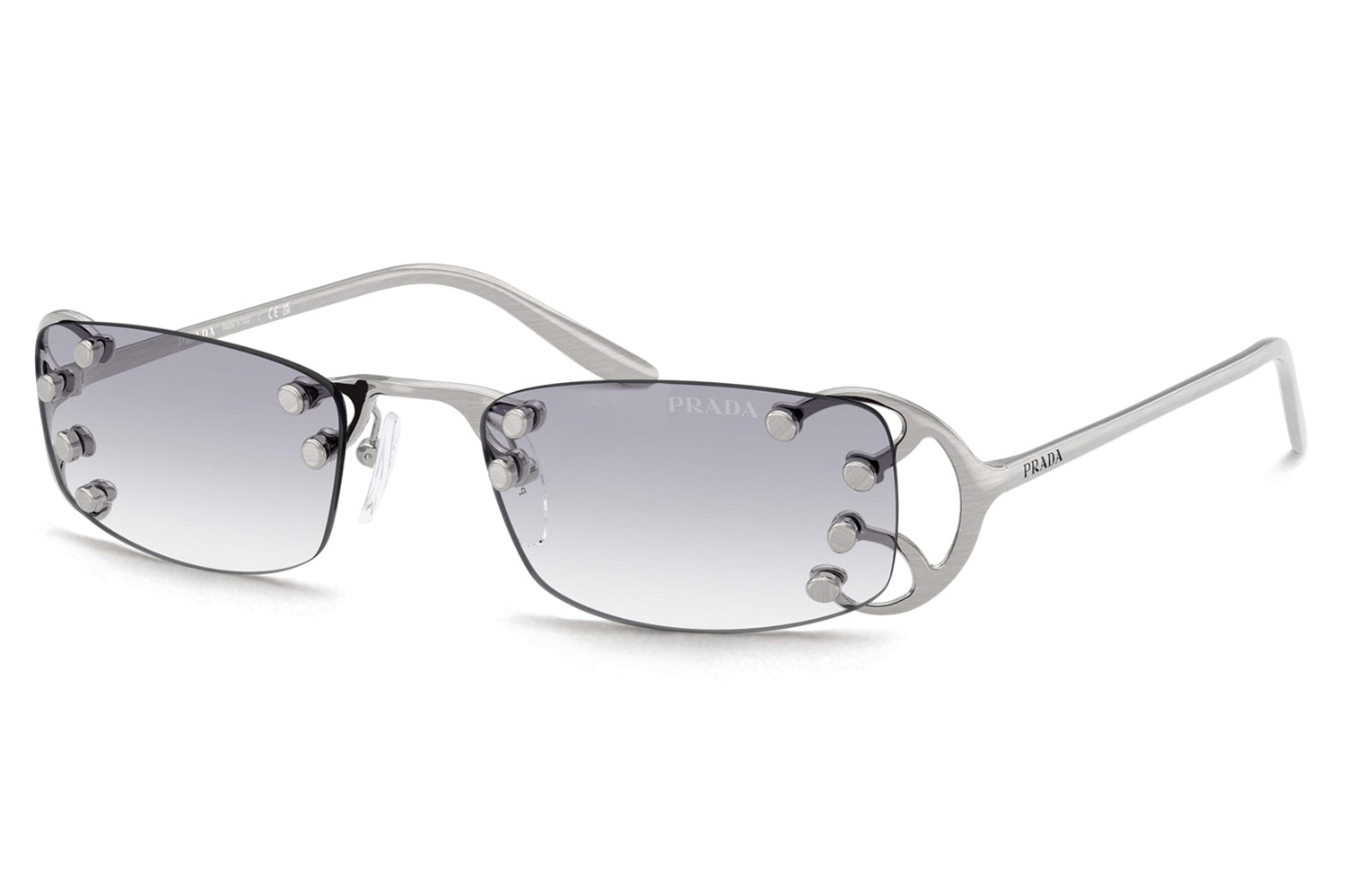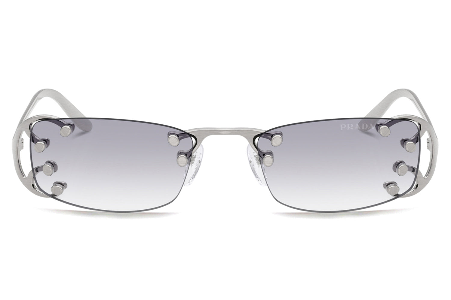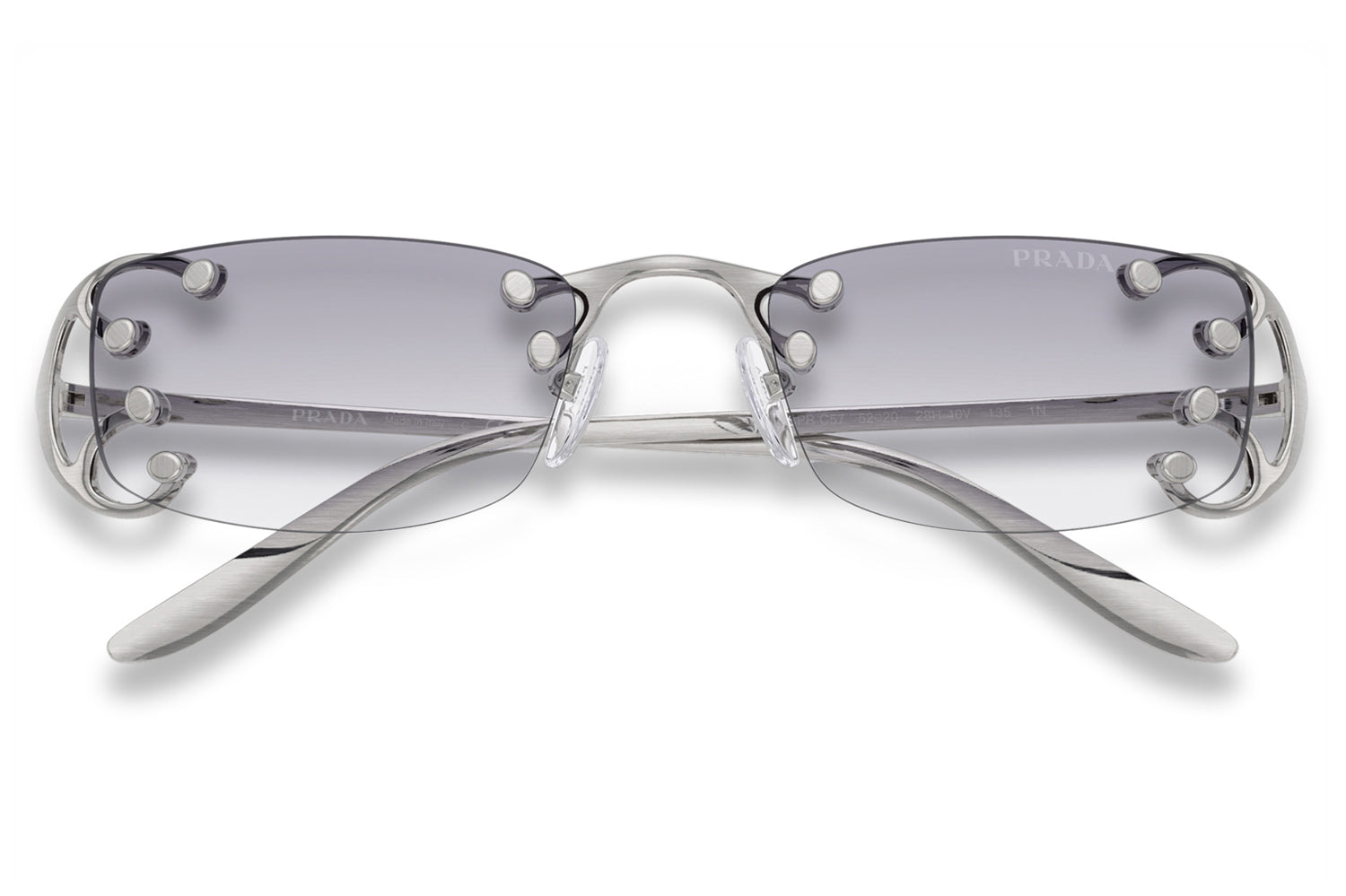 The Prada - PR C57S sunglasses introduce a striking rimless design inspired by the Fall/Winter 2025 womenswear runway. Defined by narrow rectangular lenses, the fluid metal frame branches elegantly over the lenses, creating a modern, avant-garde silhouette. Crafted with an ultra-lightweight construction, the design emphasizes raw glamour and structural innovation through minimalist detailing. The refined metalwork delivers comfort while maintaining bold visual impact. Available with clear lenses or sophisticated gradient options. These designer sunglasses blend futuristic elegance with runway-driven artistry. Perfect for fashion-forward individuals seeking a lightweight, statement-making frame with refined Prada edge and contemporary allure. Comes complete with a Prada box, protective case, cleaning cloth, and a 1-year manufacturer’s warranty.