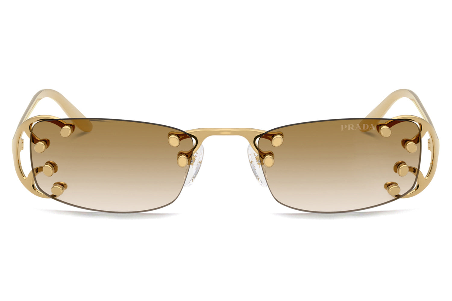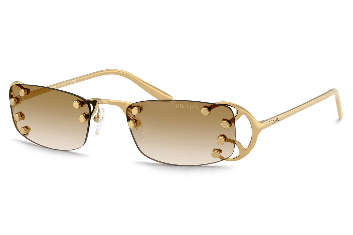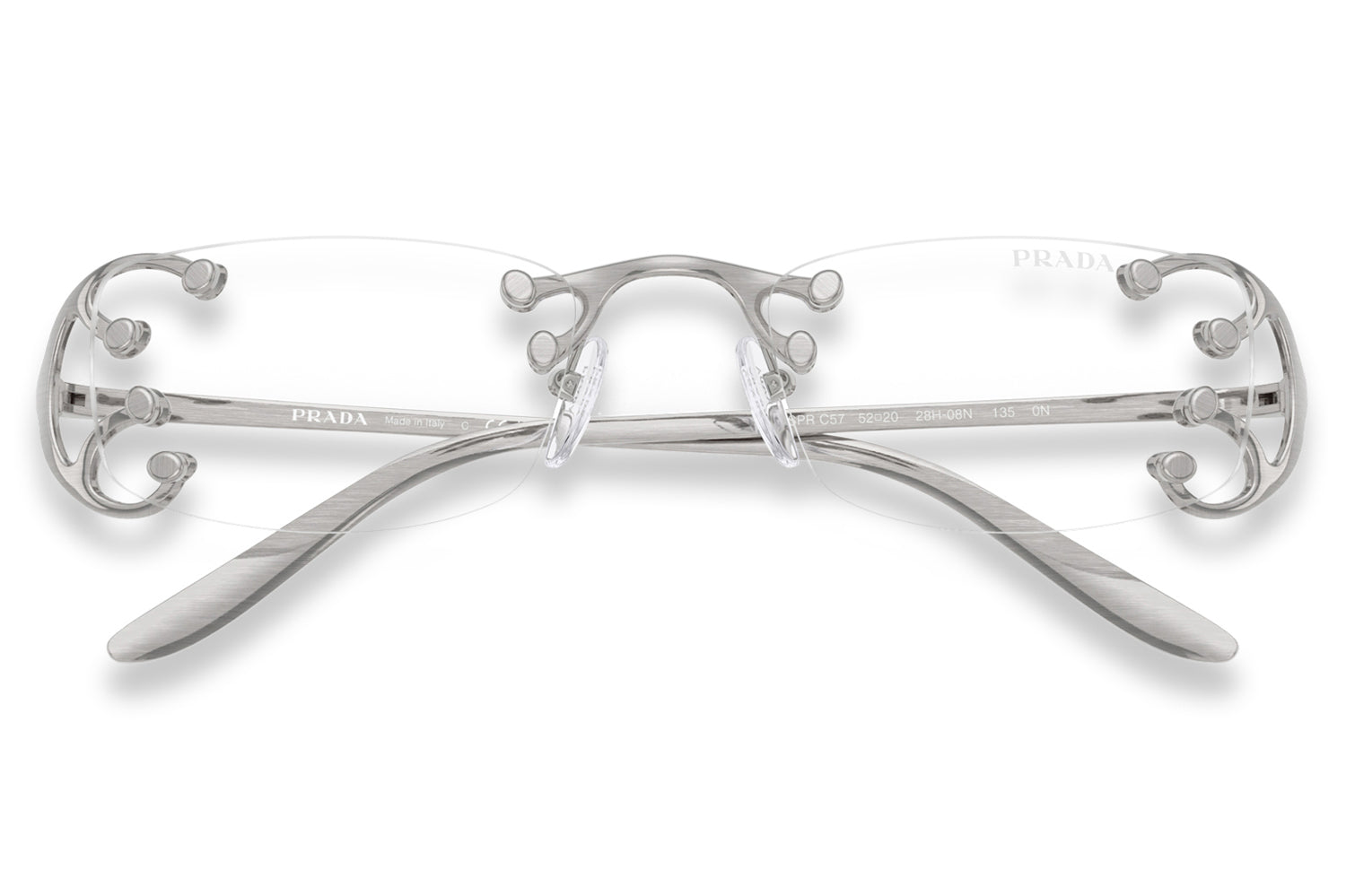 The Prada - PR C57S sunglasses introduce a striking rimless design inspired by the Fall/Winter 2025 womenswear runway. Defined by narrow rectangular lenses, the fluid metal frame branches elegantly over the lenses, creating a modern, avant-garde silhouette. Crafted with an ultra-lightweight construction, the design emphasizes raw glamour and structural innovation through minimalist detailing. The refined metalwork delivers comfort while maintaining bold visual impact. Available with clear lenses or sophisticated gradient options. These designer sunglasses blend futuristic elegance with runway-driven artistry. Perfect for fashion-forward individuals seeking a lightweight, statement-making frame with refined Prada edge and contemporary allure. Comes complete with a Prada box, protective case, cleaning cloth, and a 1-year manufacturer’s warranty.