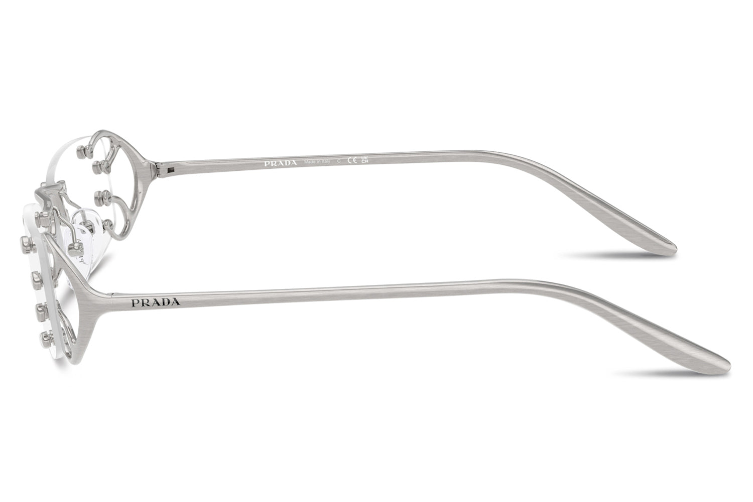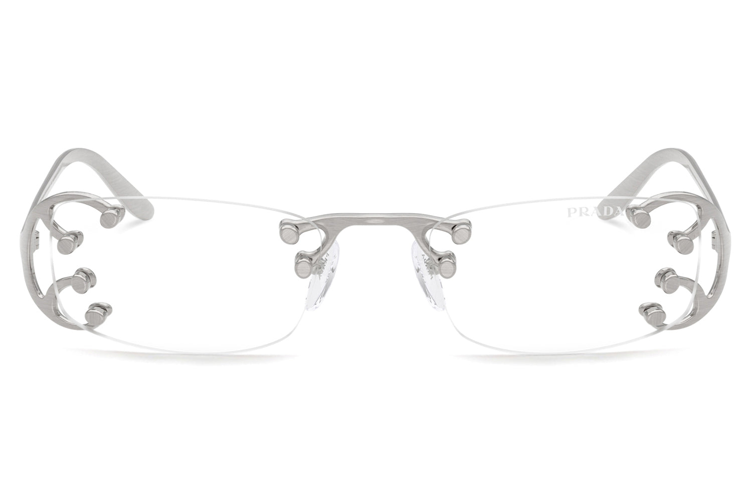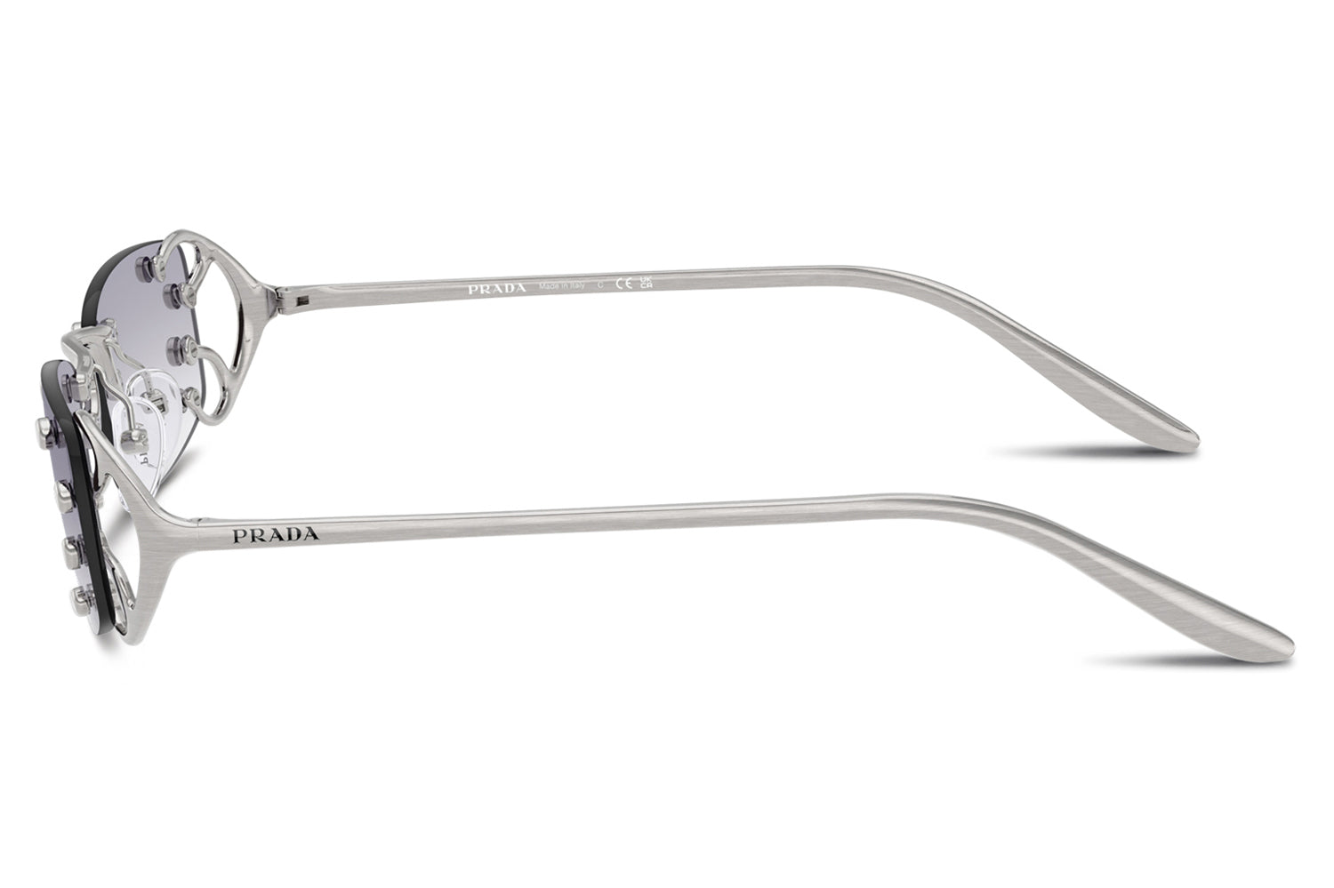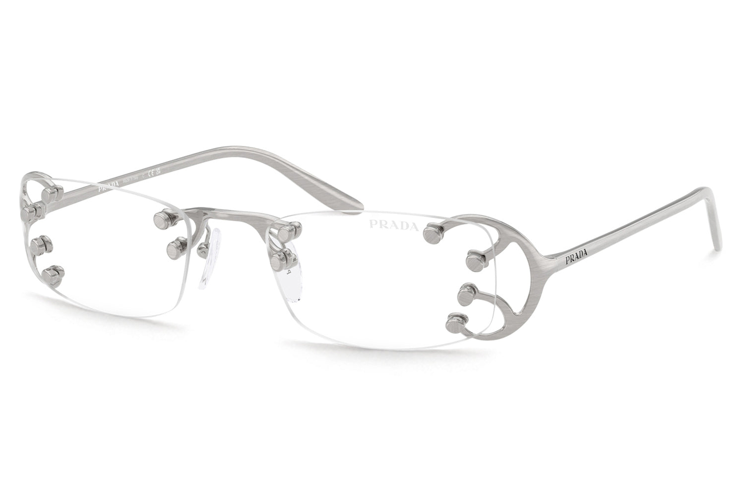 The Prada - PR C57S sunglasses introduce a striking rimless design inspired by the Fall/Winter 2025 womenswear runway. Defined by narrow rectangular lenses, the fluid metal frame branches elegantly over the lenses, creating a modern, avant-garde silhouette. Crafted with an ultra-lightweight construction, the design emphasizes raw glamour and structural innovation through minimalist detailing. The refined metalwork delivers comfort while maintaining bold visual impact. Available with clear lenses or sophisticated gradient options. These designer sunglasses blend futuristic elegance with runway-driven artistry. Perfect for fashion-forward individuals seeking a lightweight, statement-making frame with refined Prada edge and contemporary allure. Comes complete with a Prada box, protective case, cleaning cloth, and a 1-year manufacturer’s warranty.