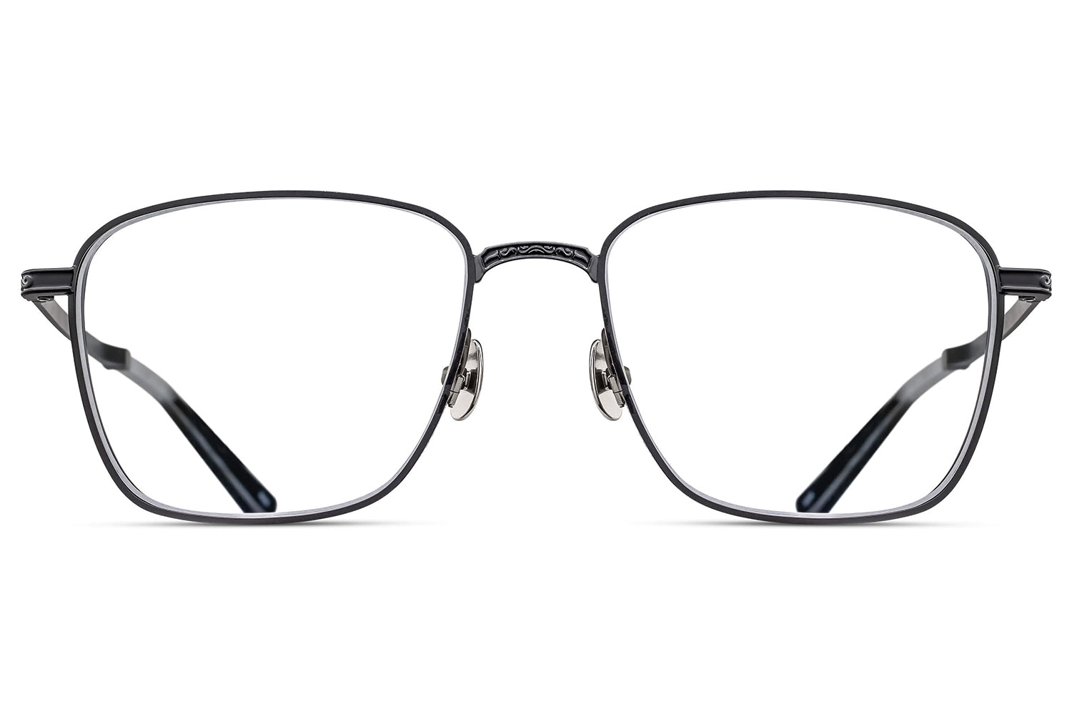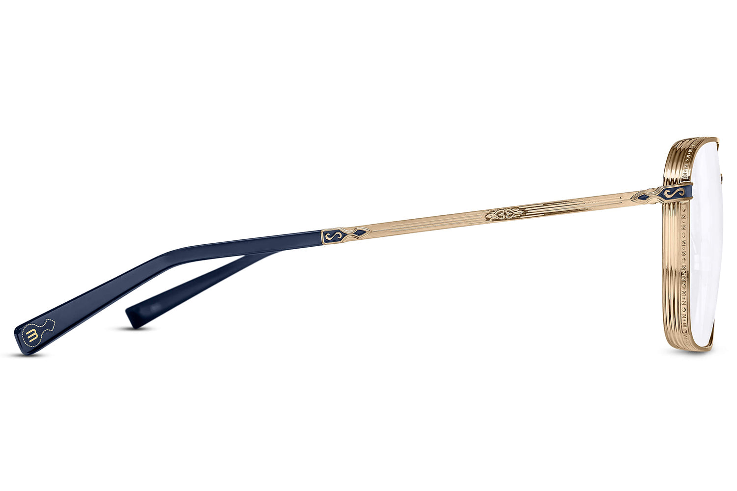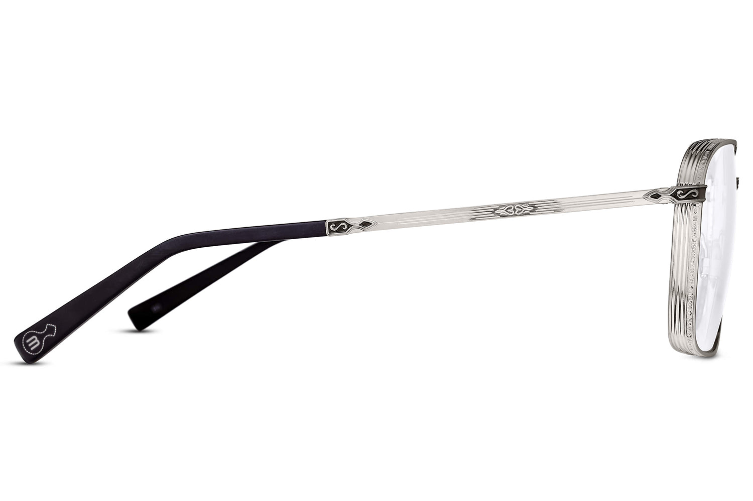 The Matsuda Eyewear // M3160 is a generously proportioned rectangular frame in high-grade titanium, distinguished by engraved temples and sculptural side shields that echo 1930s art deco geometry. Precious metal plating enhances the titanium construction, while hand-lacquered accents add depth and refinement. Each pair is handcrafted through over 200 meticulous steps, embodying Matsuda's fusion of architectural inspiration and Japanese artisanship. Includes Matsuda box, case, and cleaning cloth.