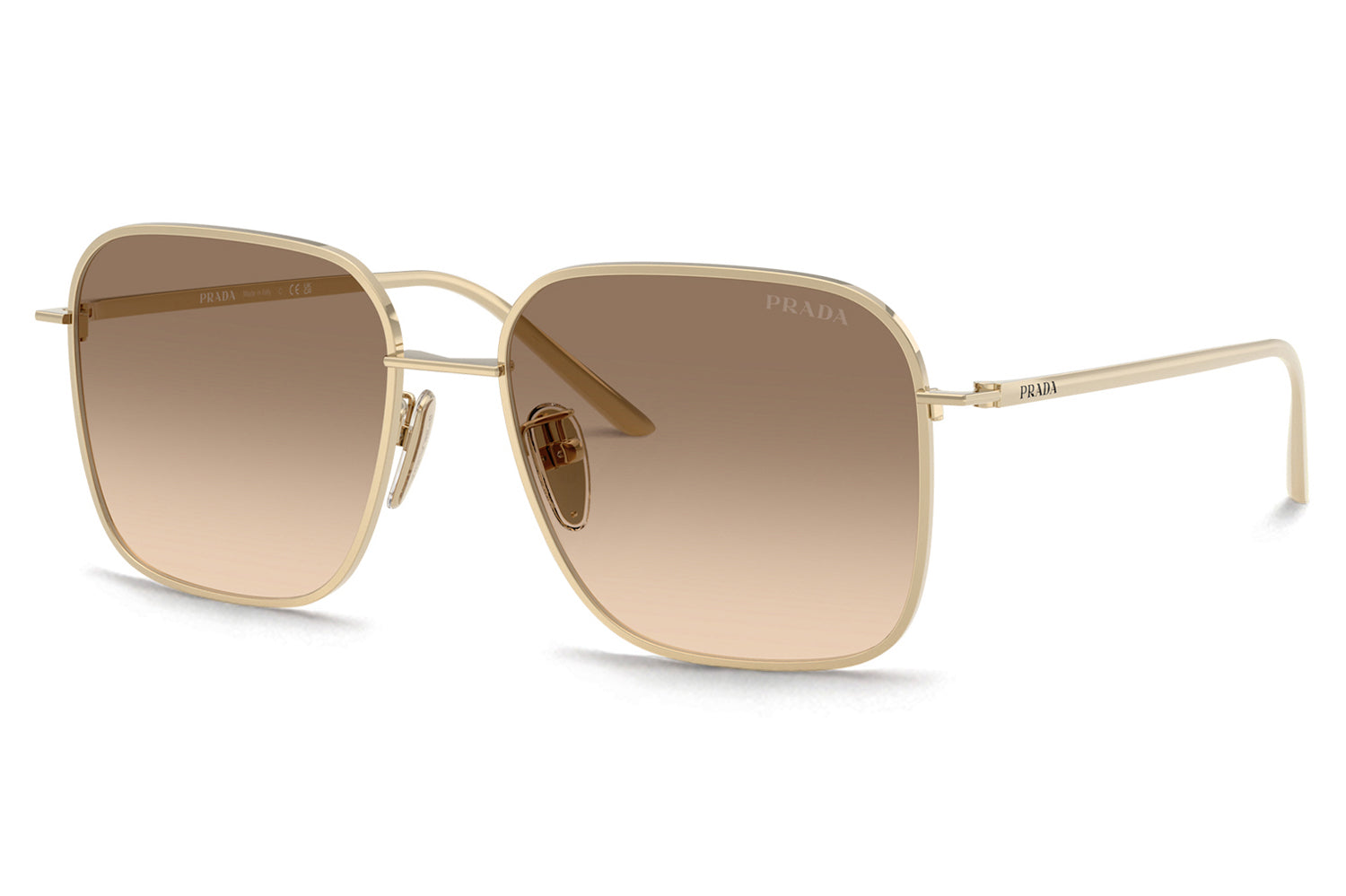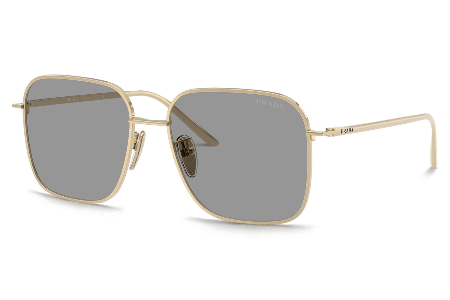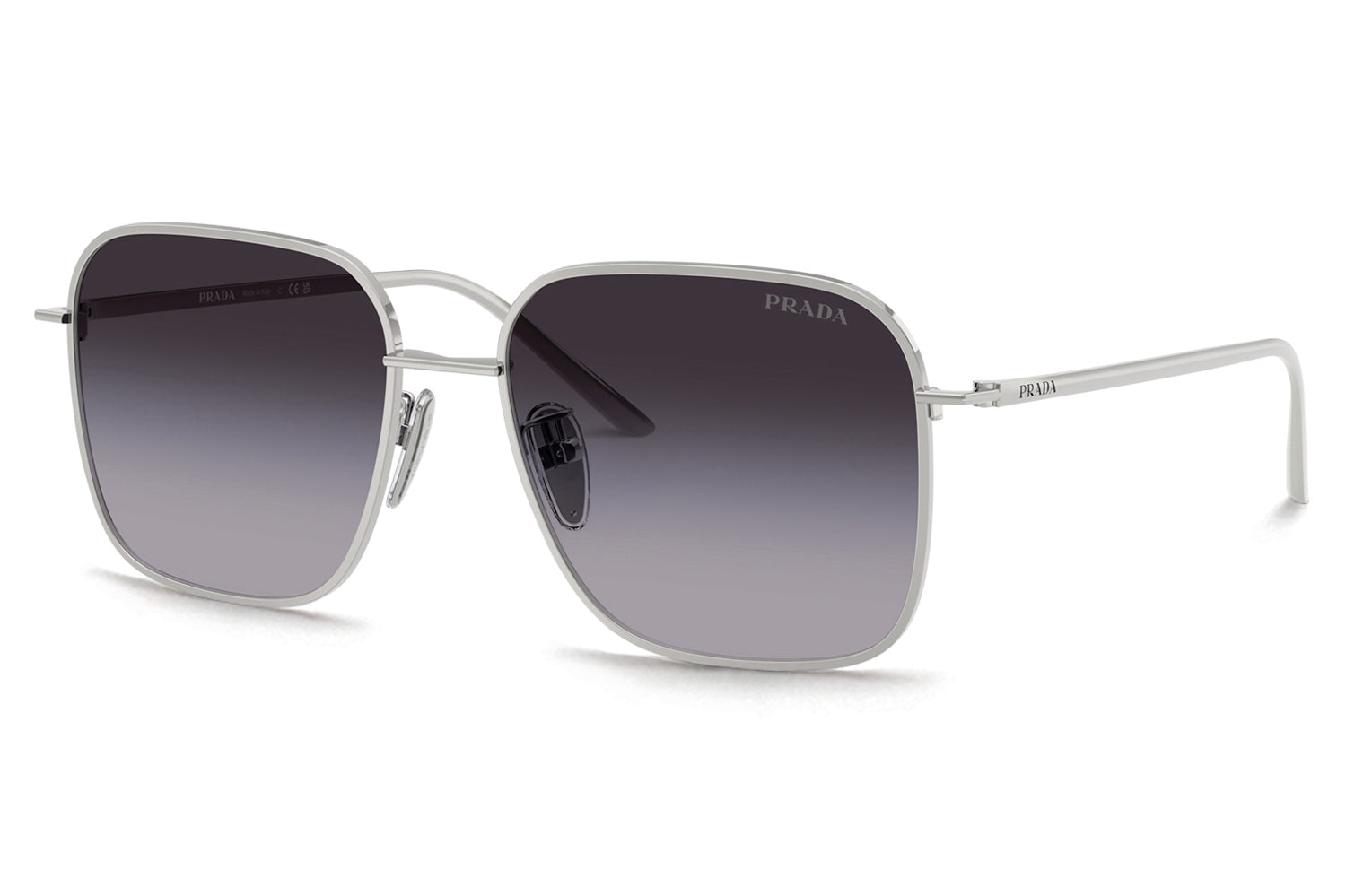 The Prada - PR C54SD is an oversized square metal pair of sunglasses that are defined by bold volumes and clean architectural lines with a flatter bridge designed for improved comfort and stability. Born from Prada’s modern design language, the frame features a straight bridge, sleek temples, a minimal hinge, and a lasered Prada logo for refined precision. Crafted from lightweight metal, it ensures balanced wear and confident structure. Available in silver, gold, and pale gold frames paired with sophisticated solid and gradient lenses. These designer sunglasses blend strong visual impact with tailored comfort. Comes complete with a Prada box, protective case, cleaning cloth, and a 1-year manufacturer’s warranty.