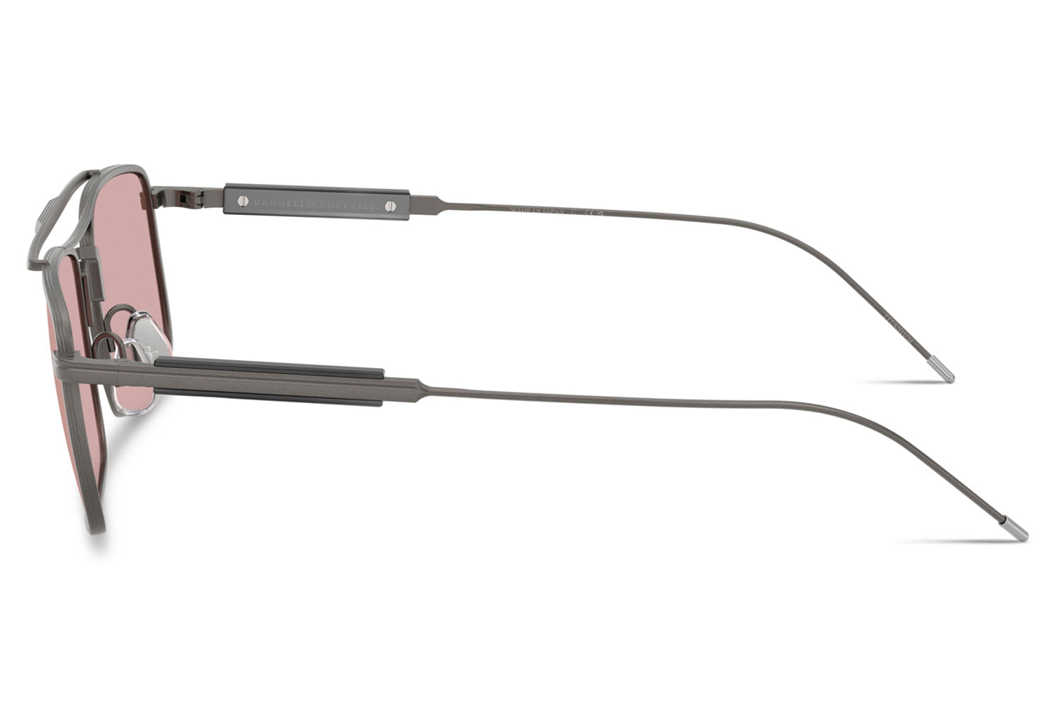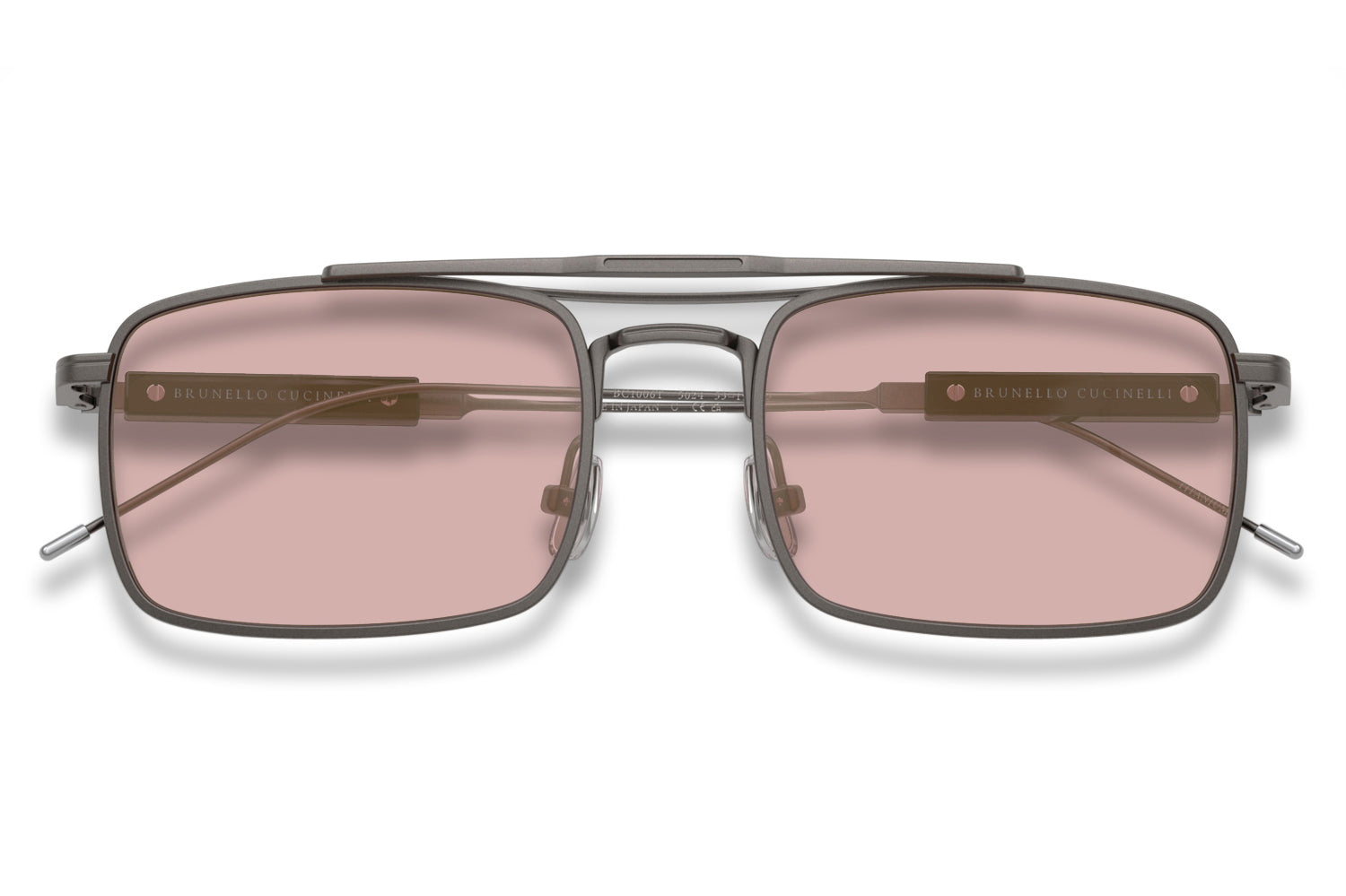 The Brunello Cucinelli - BC1006T sunglasses present refined elegance through Japanese titanium construction, featuring thick textured rims with intricate metalwork and a distinctive triple bridge with hand-applied enamel detailing. Slender temples are enhanced with luxurious acetate or horn accents surrounding the engraved logo. Available in 18K gold-plated or gunmetal finishes paired with aperitivo lenses for subtle color depth. Handmade in Japan, this design exemplifies technical precision meeting understated sophistication—a masterclass in Italian vision meeting Japanese craftsmanship and meticulous finishing. Includes Brunello Cucinelli box, hard case, soft case, cleaning cloth, and 1-year manufacturer warranty.