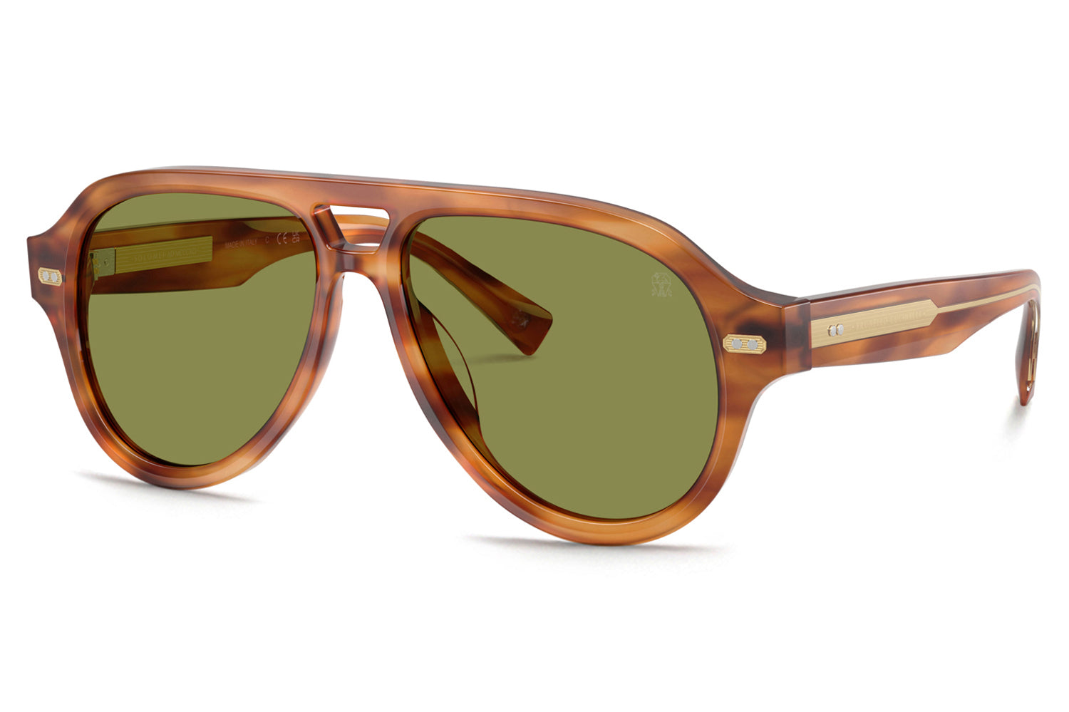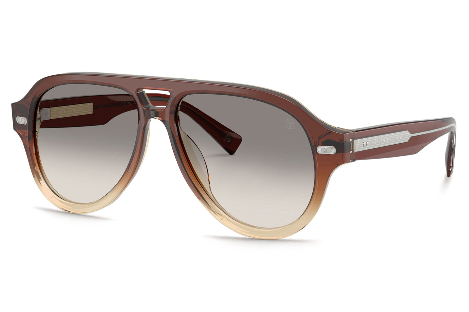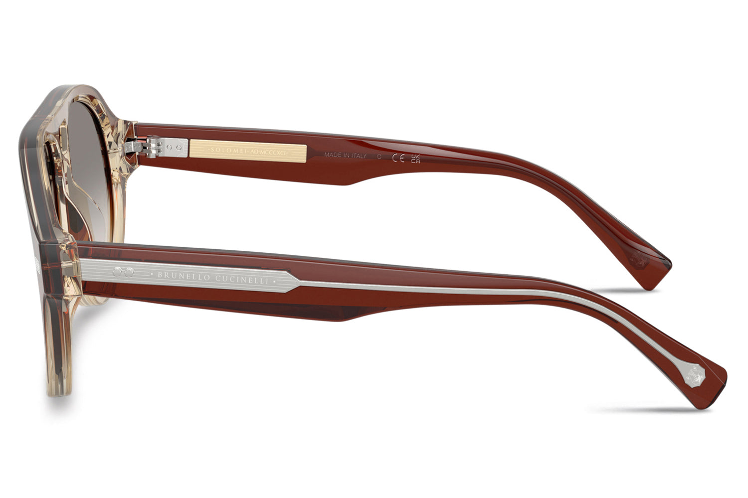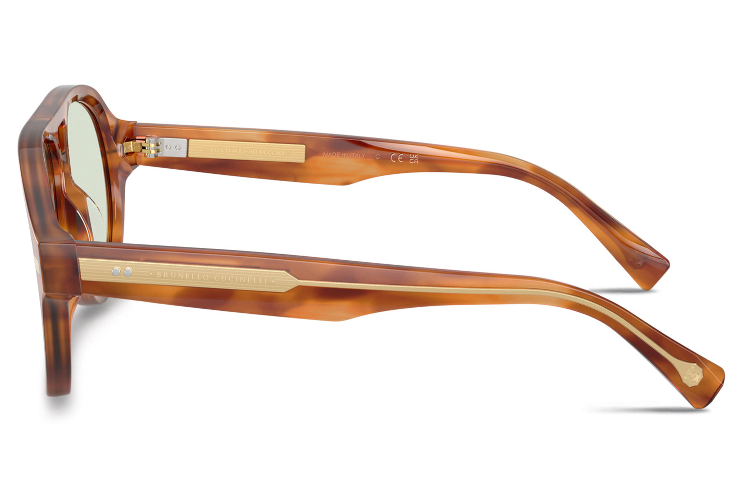 The Brunello Cucinelli - Paul (BC4017S) showcases Italian craftsmanship through a bold pilot silhouette shaped from richly milled acetate. Offered in refined dark tones, bi-color blends, and a standout honey havana with gold-plated accents, it pairs modern elegance with understated luxury. Transparent temples reveal a custom engraved core wire, while refined lens options including green Transitions™ complete this sophisticated expression of Brunello Cucinelli design. Handmade in Italy. Includes Brunello Cucinelli box, hard case, soft case, cleaning cloth, and 1-year manufacturer warranty.
