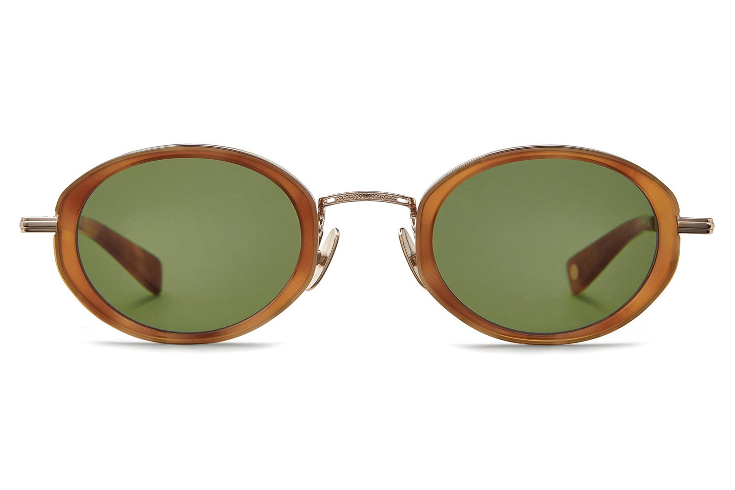 The Garrett Leight // Alper is a retro-inspired oval frame that blends vintage aesthetics with modern craftsmanship. Constructed in metal with an acetate insert for added structure and depth, the Alper showcases Garrett Leight’s signature Fern filigree bridge, detailed grooved end pieces, and temples fitted with integrated spring hinges for flexibility and durability. Adjustable nose pads ensure a secure and comfortable fit, while high-quality lenses provide complete UV protection. With its balance of refined detailing and timeless silhouette, the Alper is a standout design within the Garrett Leight collection. Includes Garrett Leight case, cleaning cloth, and 1-year manufacturer's warranty.