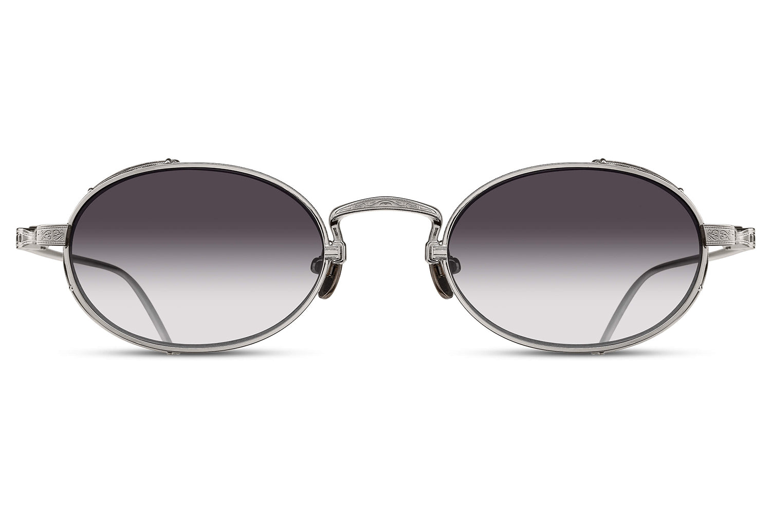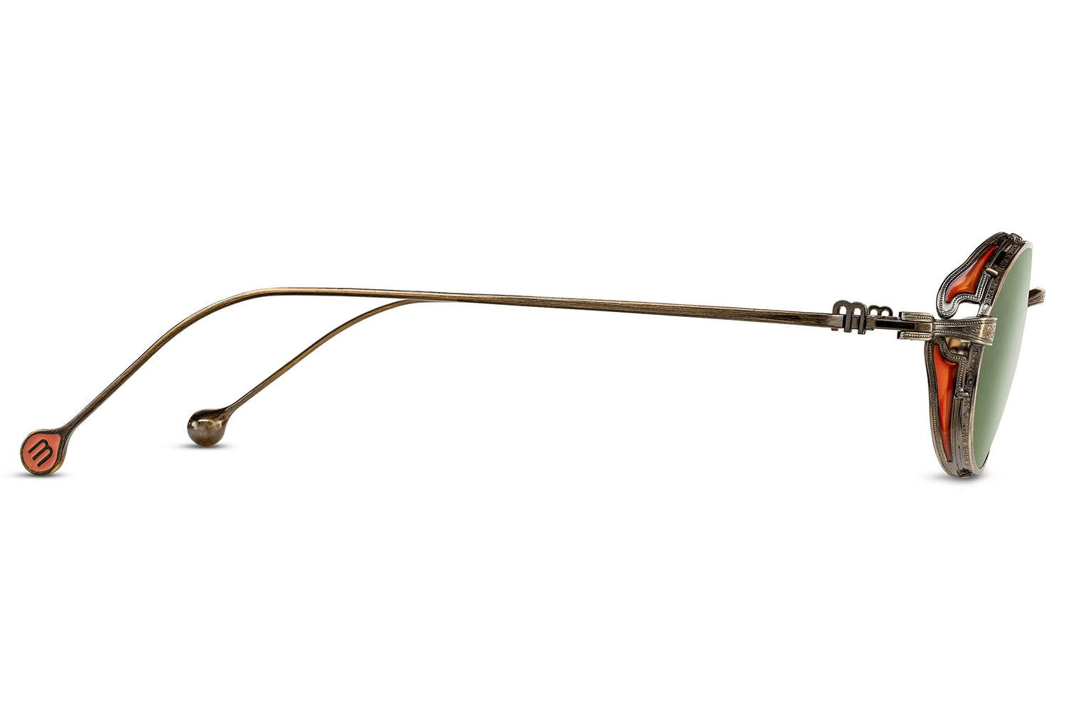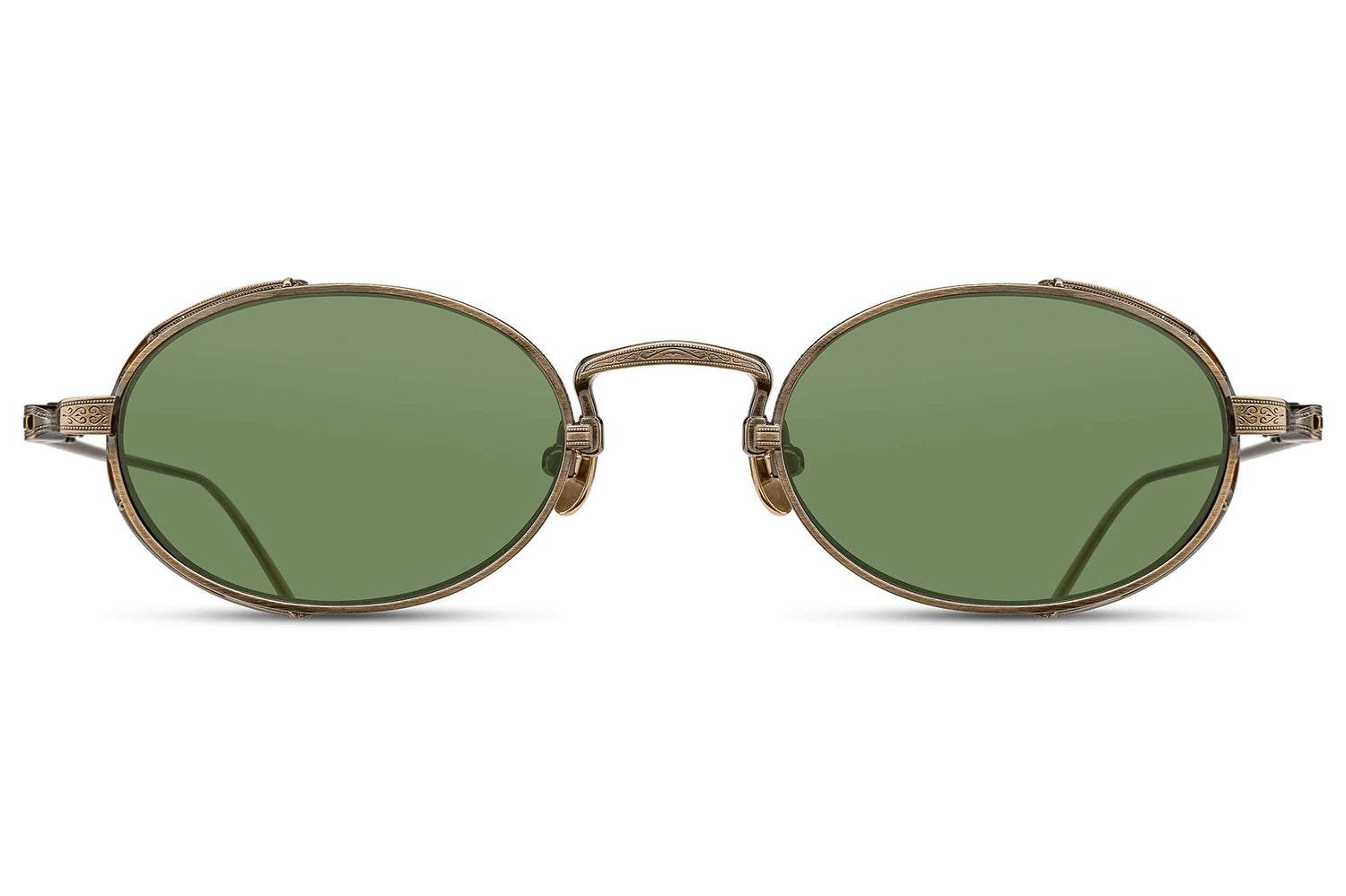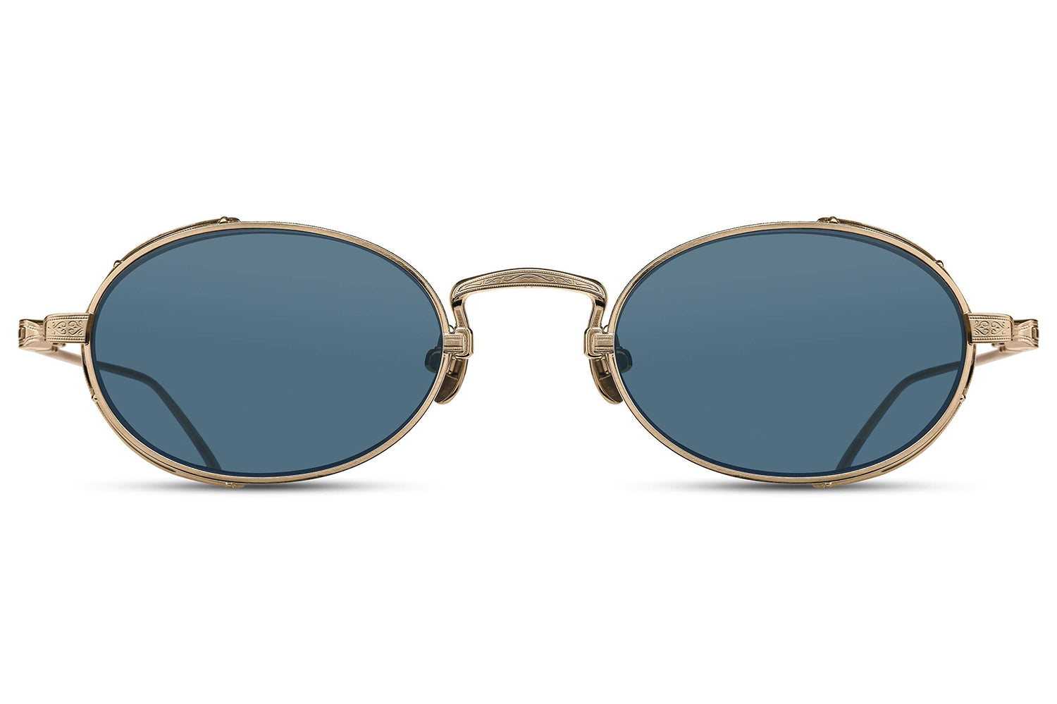 The Matsuda - M3169 balances vintage influence with modern precision in a refined oval titanium silhouette. Born from Matsuda's Japanese heritage of meticulous craftsmanship, hand-lacquered side shields inspired by Art Nouveau ornamentation create distinctive sculptural detail. Finished in 22.5K gold or palladium with signature M+N temple engravings that showcase the brand's artisanal legacy. Lightweight titanium construction ensures all-day comfort while delivering structural elegance and ornamental refinement. Handmade in Japan with utmost attention to detail. A marriage of structure and ornamentation in distinctly modern form—where heritage technique meets contemporary expression with subdued confidence and timeless character. Handmade in Japan. Includes Matsuda box, case, and cleaning cloth.