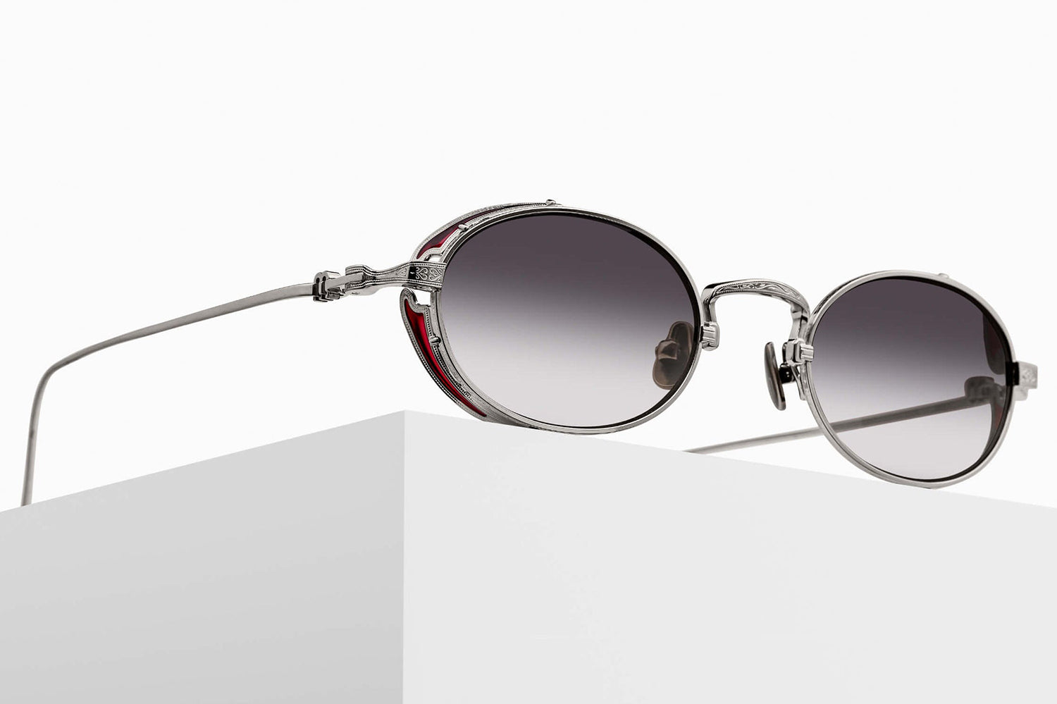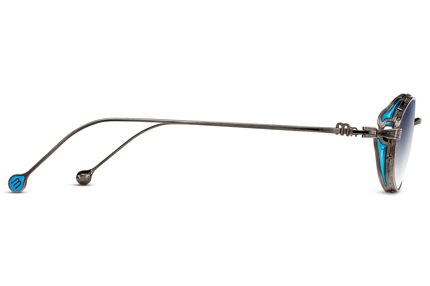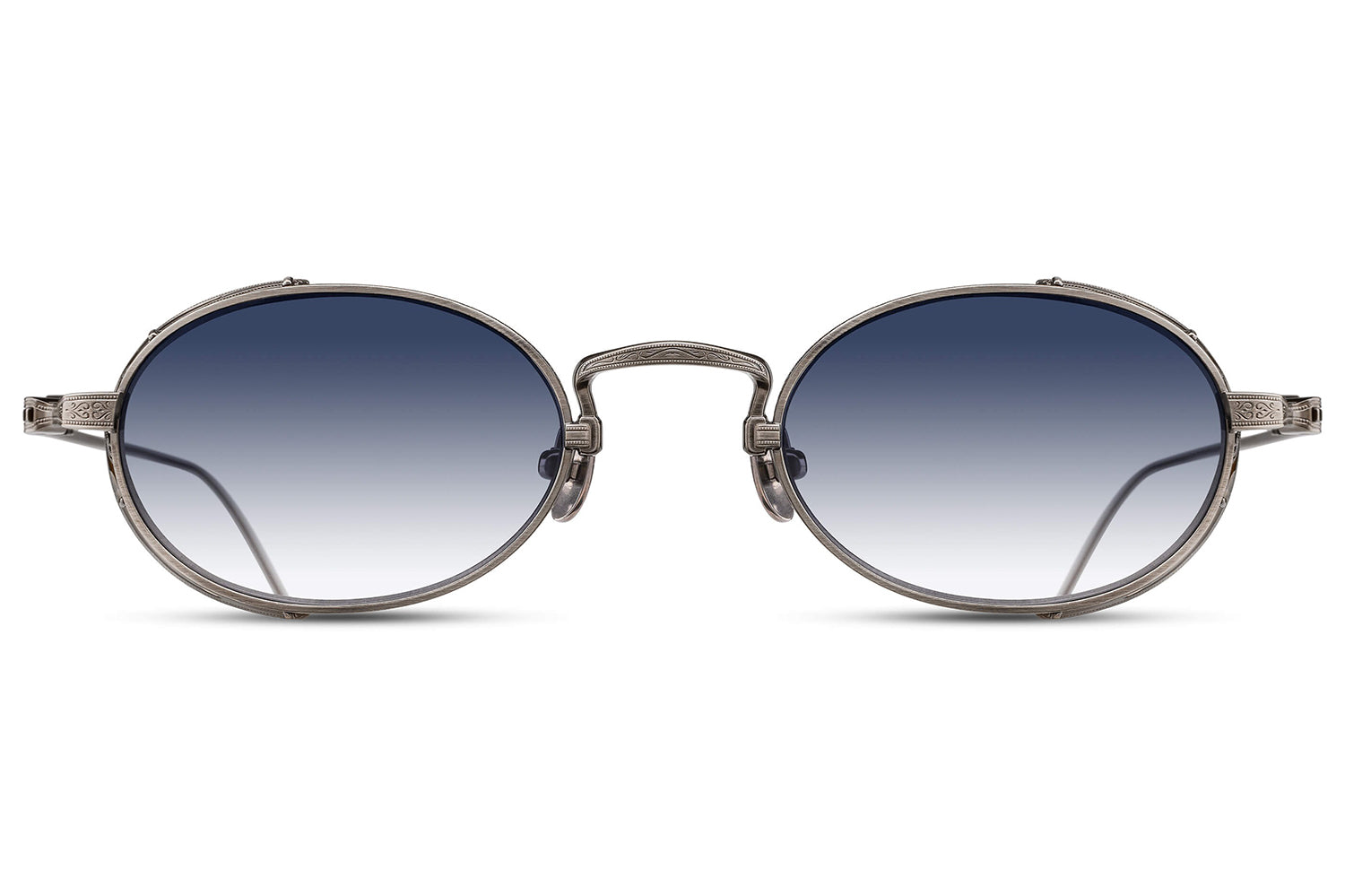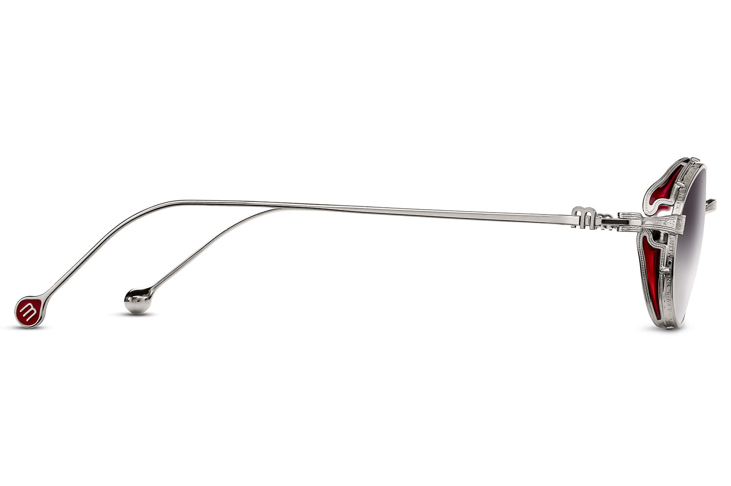 The Matsuda - M3169 balances vintage influence with modern precision in a refined oval titanium silhouette. Born from Matsuda's Japanese heritage of meticulous craftsmanship, hand-lacquered side shields inspired by Art Nouveau ornamentation create distinctive sculptural detail. Finished in 22.5K gold or palladium with signature M+N temple engravings that showcase the brand's artisanal legacy. Lightweight titanium construction ensures all-day comfort while delivering structural elegance and ornamental refinement. Handmade in Japan with utmost attention to detail. A marriage of structure and ornamentation in distinctly modern form—where heritage technique meets contemporary expression with subdued confidence and timeless character. Handmade in Japan. Includes Matsuda box, case, and cleaning cloth.
