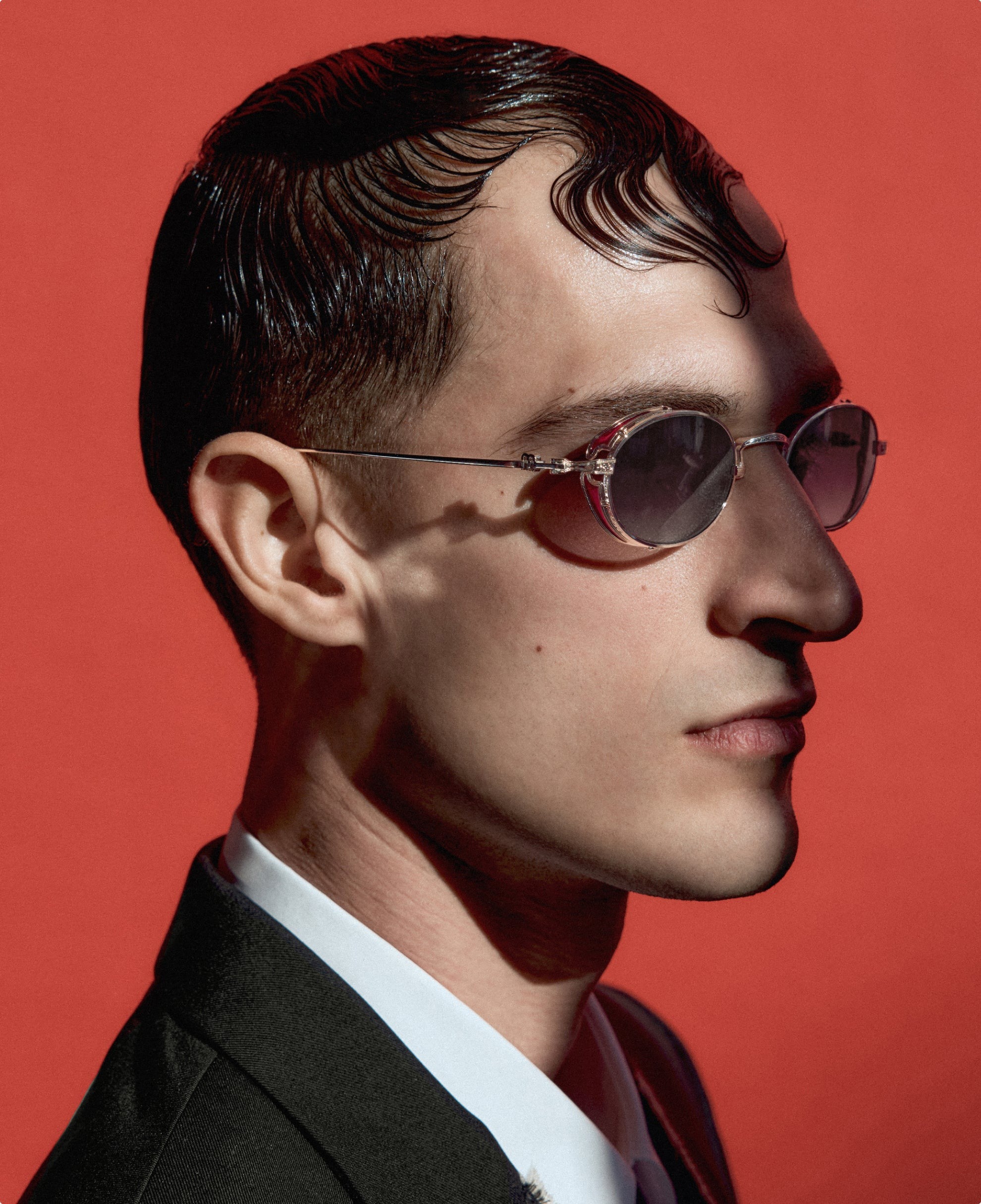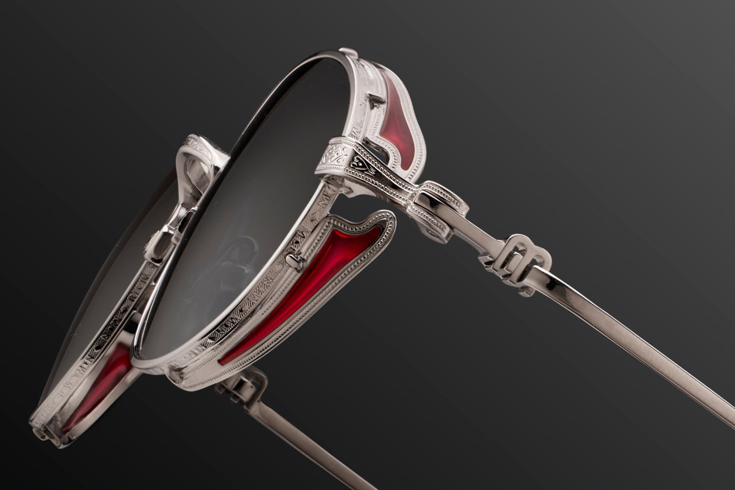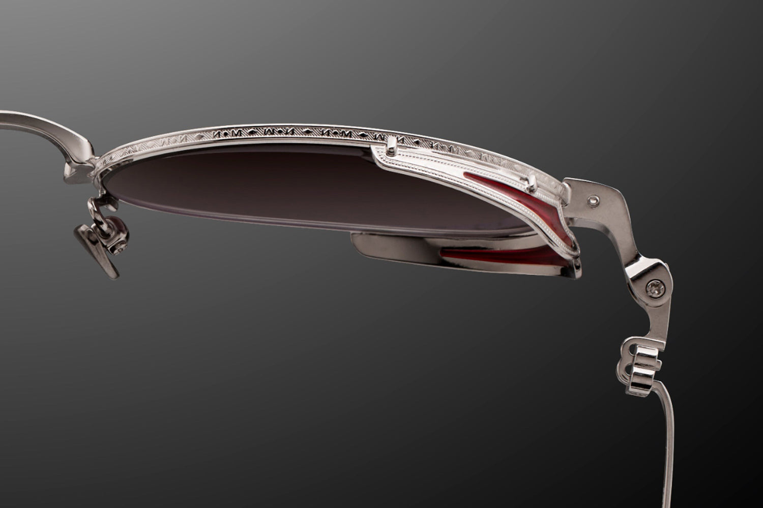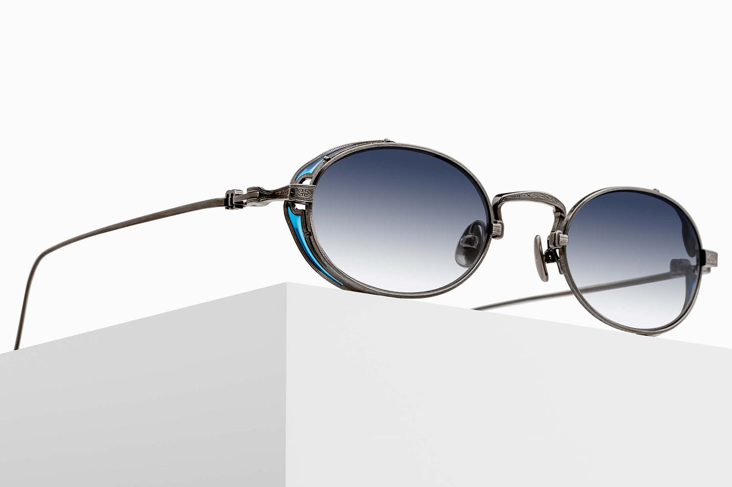 The Matsuda - M3169 balances vintage influence with modern precision in a refined oval titanium silhouette. Born from Matsuda's Japanese heritage of meticulous craftsmanship, hand-lacquered side shields inspired by Art Nouveau ornamentation create distinctive sculptural detail. Finished in 22.5K gold or palladium with signature M+N temple engravings that showcase the brand's artisanal legacy. Lightweight titanium construction ensures all-day comfort while delivering structural elegance and ornamental refinement. Handmade in Japan with utmost attention to detail. A marriage of structure and ornamentation in distinctly modern form—where heritage technique meets contemporary expression with subdued confidence and timeless character. Handmade in Japan. Includes Matsuda box, case, and cleaning cloth.